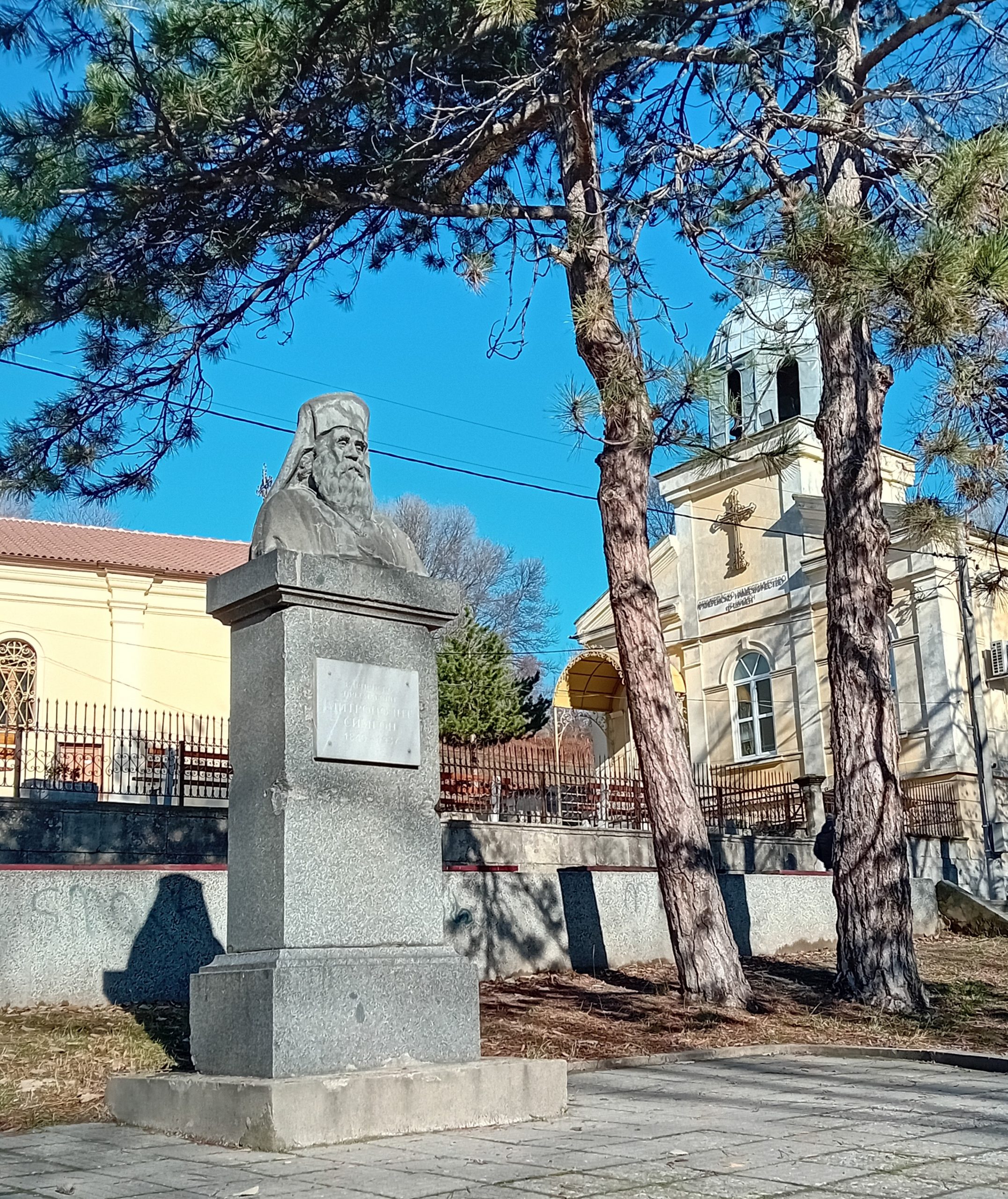 (варварски) паметника на митрополита и градинката пред църквата „Свето Вознесение“ опустява. Постаментът е съборен с омотана около него верига. Бронзовият бюст изчезва. По несигурни данни – хвърлен в голям водоем край града.